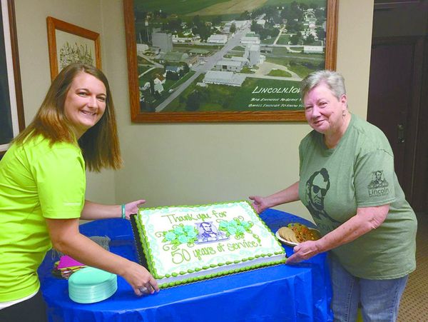 “ Photo by Margaret Thomsen Thank you for 50 years of service!” says it all. Diane Sebbert has been working at Lincoln Saving Bank since June 11, 1968. Pictured are Branch Manager Sara Forrester and Diane Sebbert.