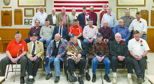 Pictured are some of the veterans at the March Birthday Party: Front Row (l-r) Post Commander Ron Busch, John Buskohl, Ray Landt, Robert Mohr, Dale Osten, Chuck Wickersham, and Robert Knaack. Middle Row: Dennis Haack, Roger Sievers, Russ Rosenberger, 3rd District Commander Bob Daniels, Loren Frericks, Leo Lohse, Robert Herink, and Terry Schmitz. Back Row: Jerry Sonksen, Jared Bauch, John Clausen, Joe Stanley, Jim Gethmann, Russ Payne, Rich Raum, Rodney Lorenz,and Larry Pieper.