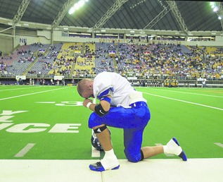Caleb Hamer, the quarterback of Gladbrook-Reinbeck’s 2004 state runner-up football team, kneels in prayer prior to the Rebels’ Class 1A championship game against Council Bluffs St. Albert in this Nov. 19, 2004, file photo. Hamer and other members of the 2004 team were honored at halftime of a G-R football game earlier this season, and many of them will be watching in person, on television or online when their alma mater challenges top-ranked Logan-Magnolia in today’s Class 1A title game in Cedar Falls. File photo