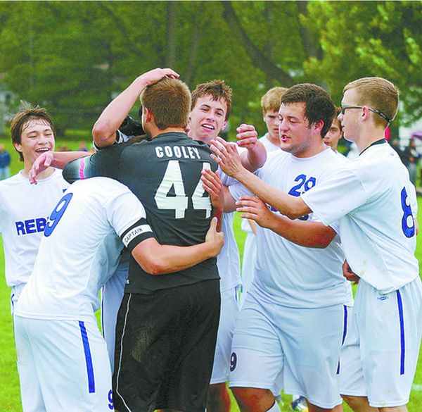 Gladbrook-Reinbeck goalkeeper Josh Cooley (44) is mobbed by his teammates after helping the Rebels deliver a third consecutive shutout, Saturday’s 1-0 win over Benton Community in the Class 1A Substate 3 championship game in Reinbeck. Cooley had six saves in the match. Photos by Ross Thede