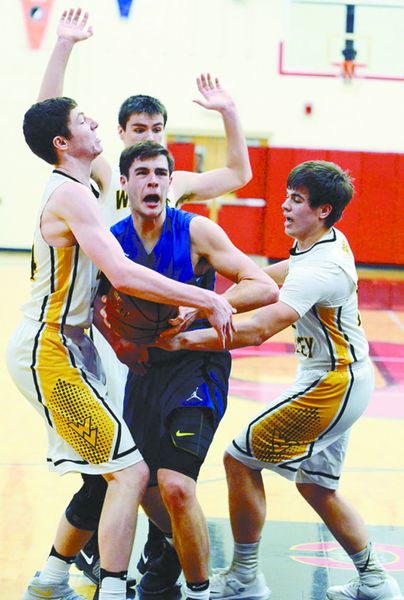 Joe Smoldt (20) tries to split three Wapsie Valley defenders during the second half of Saturday night’s Class 1A Substate 3 game at Cedar Falls. Smoldt had 33 points and the Rebels won in overtime, 68-62. PHOTO BY STEPHEN KOENIGSFELD