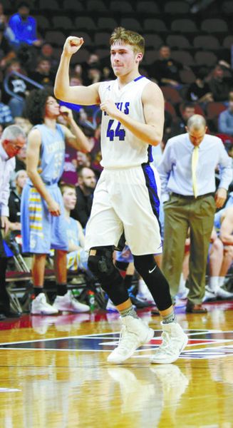Gladbrook-Reinbeck’s Tyler Pierce pumps his fist after the Rebels won Monday’s Class 1A state quarterfinal against Lynnville-Sully at Wells Fargo Arena in Des Moines. The Rebels won 53-50. Photo by Adam Ring