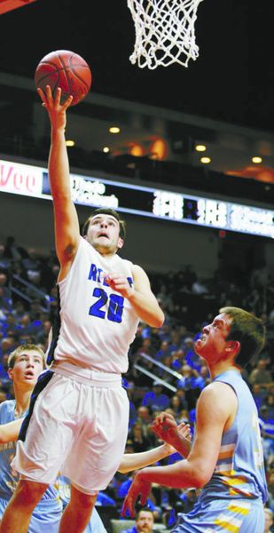 Gladbrook-Reinbeck’s Joe Smoldt (20) goes to the basket against Lynnville-Sully’s Rylan James, right, in the fourth quarter of the Class 1A boys’ state basketball quarterfinal at Wells Fargo Arena in 2017. -- Sun Courier File Photo