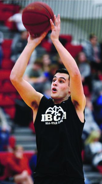 Gladbrook-Reinbeck senior Joe Smoldt shoots during the first round of the 3-point contest at Saturday’s Iowa Basketball Coaches Association All-Star Series at Dallas Center-Grimes High School in Grimes. Smoldt finished second in the boys competition. Photo by Ross Thede