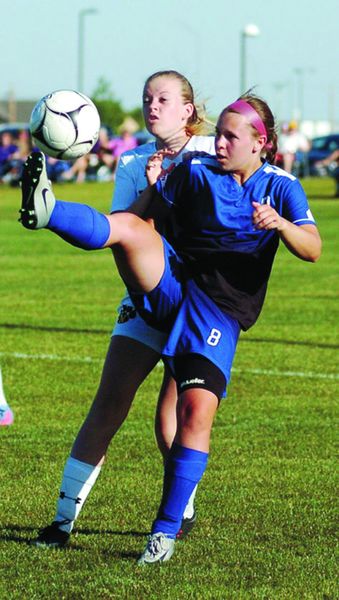 Grundy Center/Gladbrook-Reinbeck sophomore midfielder Sydney Mathews (8) attempts to play the ball back over her head while being pressured by Nevada’s Mikayla Long during the first half of Monday’s Class 1A Region 4 final in Nevada. The fifth-ranked host Cubs defeated the Rebels, 4-0, to advance to the state tournament for the sixth year in a row. Photo by Ross Thede