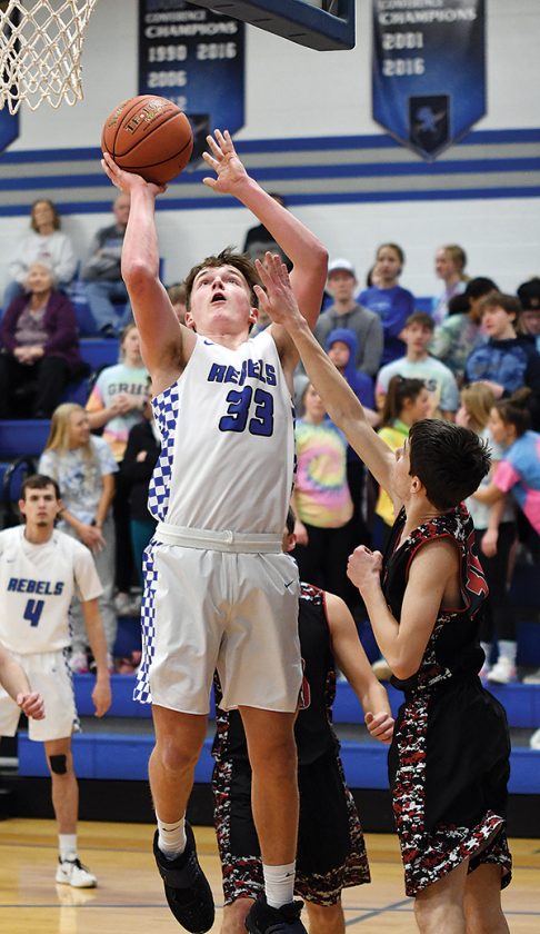 Gladbrook-Reinbeck senior Tristen Sanford-Anders (40) puts a layup off the backboard during the second half of the sixth-ranked Rebels’ 85-41 victory over HLV. Photo by Noah Rohlfing