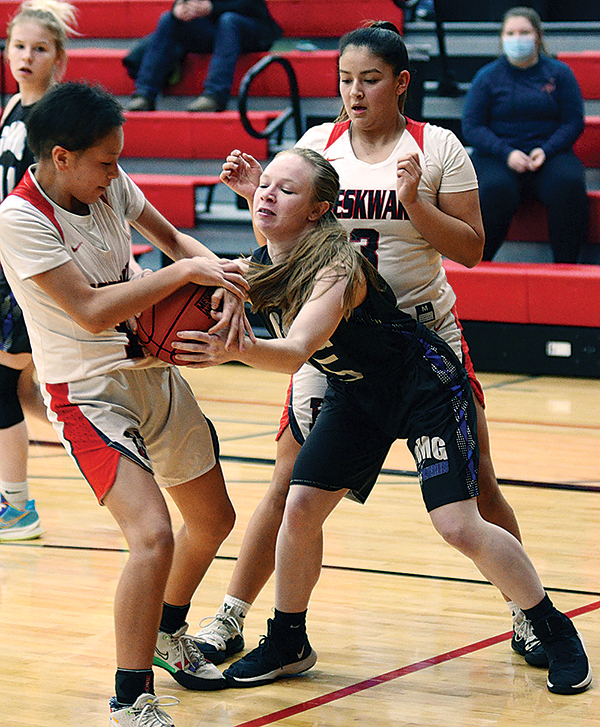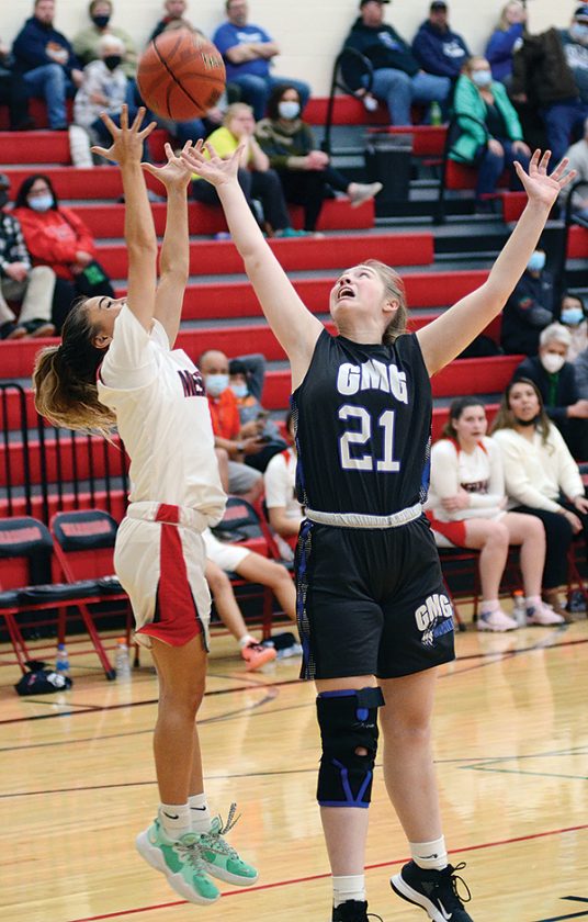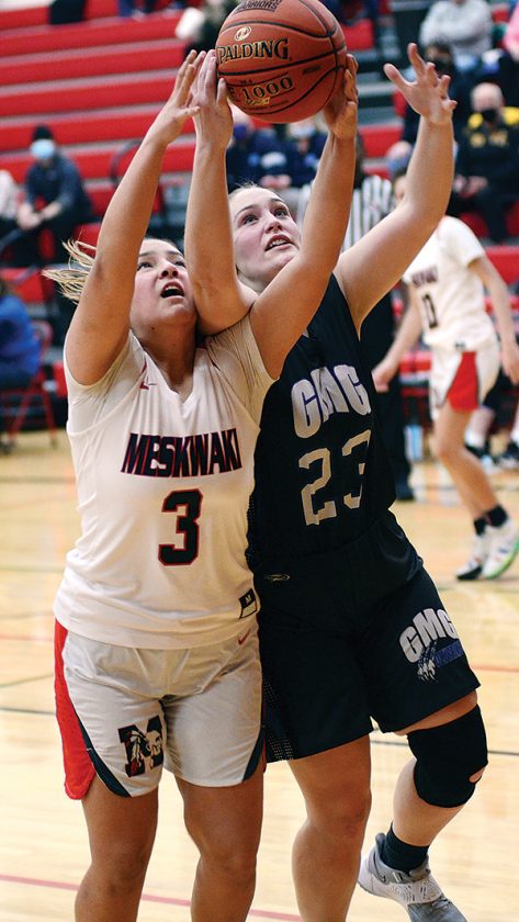 Three decisive passes up the court got the GMG girls’ basketball team through Meskwaki’s problematic zone press and resulted in a layup near the end of the first quarter.