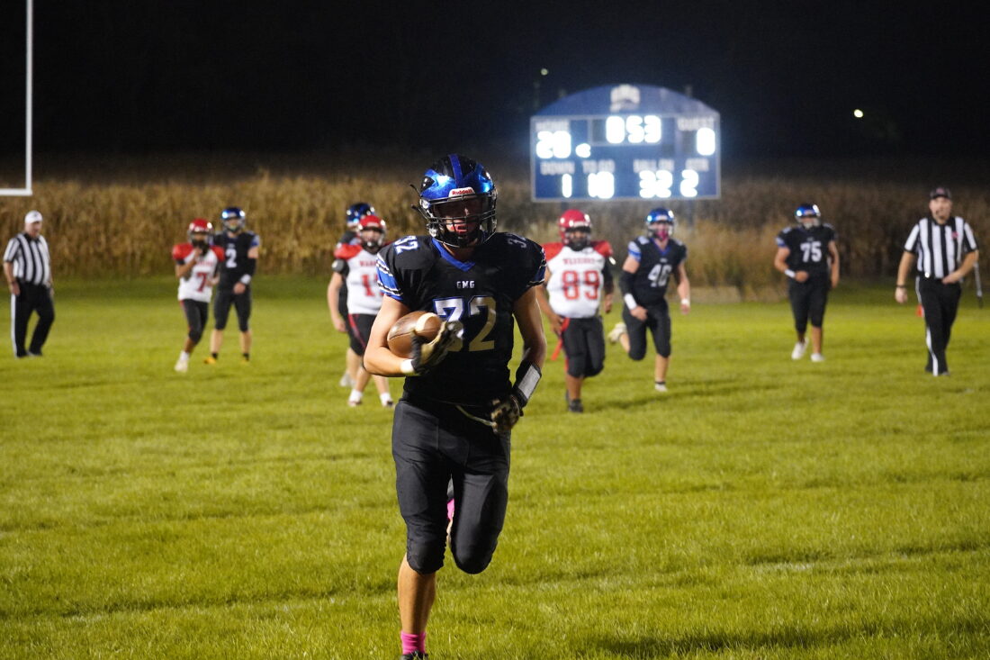 - GMG senior Rider Kupka scores the Wolverines’ fourth touchdown against Meskwaki Settlement on Friday, Oct. 10, in Garwin. PHOTO BY RUBY F. MCALLISTER