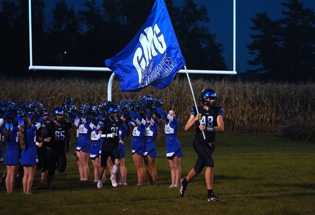 Prior to kickoff that evening, GMG celebrated Senior Night by recognizing fall athletes including football student-athletes Jonas Buchanan, Liam Fitzsimmons, and Rider Kupka. Also recognized, cross country student-athletes Brayton Davis, Henry Dieleman, and Drayson Stephenson; and football cheer student-athletes Isabella Cobb, Boudica Fitzsimmons, and Jocie Parks. Following Senior Night introductions, the Wolverines stormed the field by charging out of the adjacent corn and through the cheer team’s pom pom entrance chute.