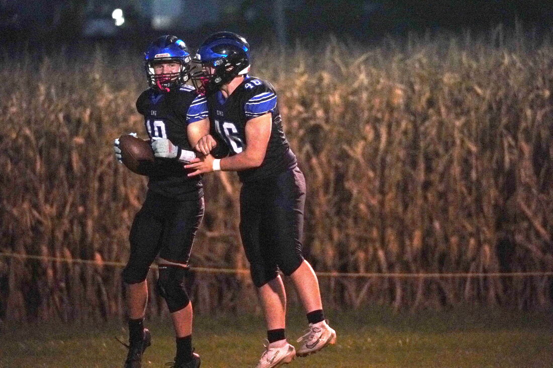 Sophomore Easton Sash, left, leaps into the air in celebration alongside his teammate, junior Caleb Ferch, after rushing in a 42-yard touchdown against the Meskwaki Warriors. Sash recorded the strike barely 30 seconds into the Friday, Oct. 10 game in Garwin. PHOTO BY RUBY F. MCALLISTER