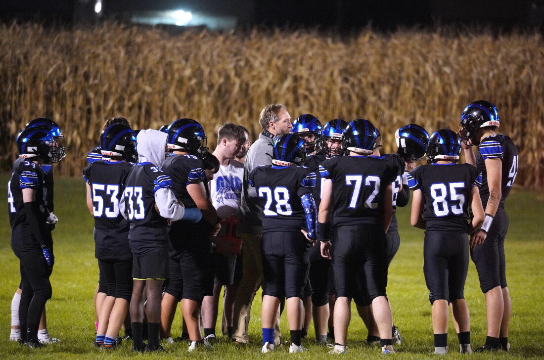 - GMG assistant coach Seth Hedman, center, speaks to his players during a timeout on the field Friday evening in Garwin. PHOTO BY RUBY F. MCALLISTER