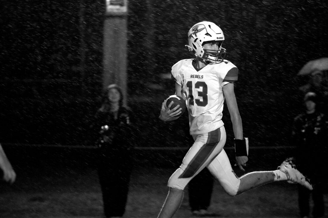 Amidst a downpour, Rebels quarterback Trevor Mathern carries in his team’s second touchdown of the game against the North Tama Redhawks on Friday, Oct. 17, at Dennis Field in Traer. Mathern carried the ball five times for 47 yards and one touchdown that evening. PHOTO BY RUBY F. MCALLISTER