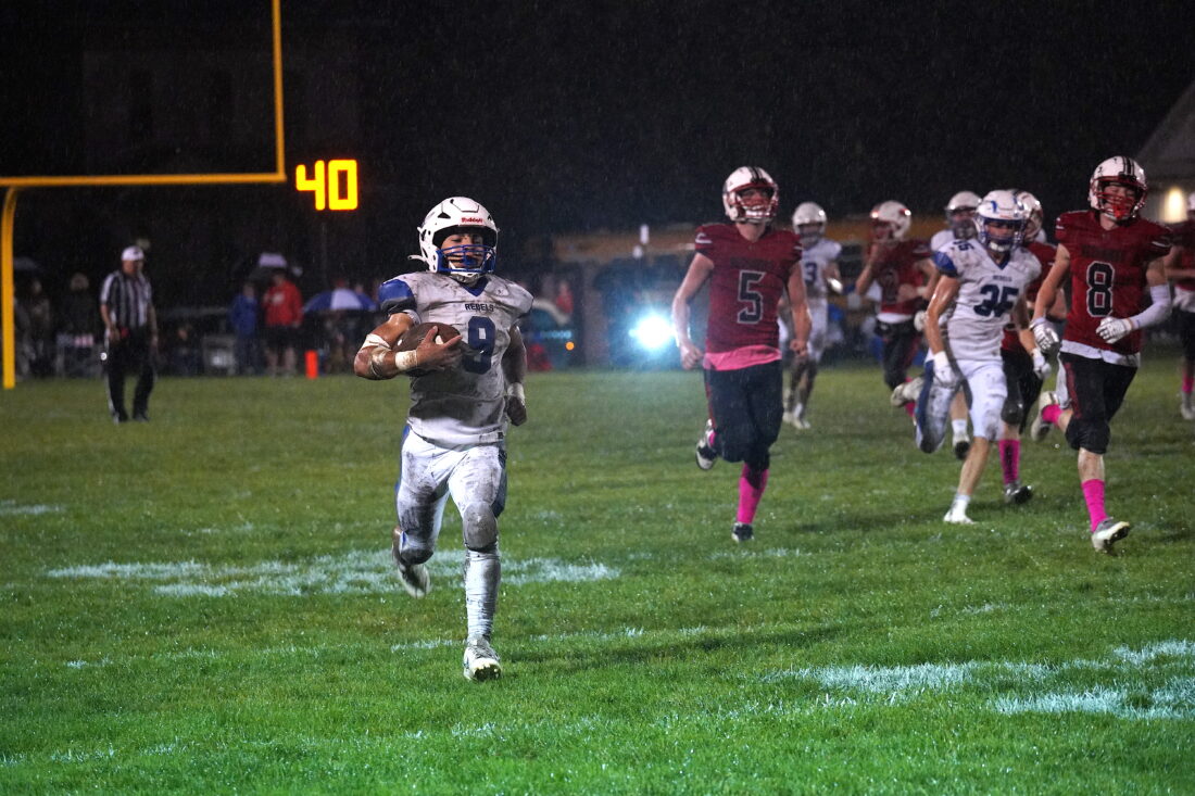 The rain was so intense at times Friday evening, it was as if an outdoor spigot had been wrenched wide open. By the time the game finished, the grassy gridiron was waterlogged and soupy, making it hard to discern the Redhawks’ black numbers across their mudcaked red jerseys while the Rebels’ white uniforms had turned begrimed and gray. But even the rain could not stop the Rebels who pounced almost immediately after kickoff. On the first snap, the Redhawks fumbled and G-R jumped on it, putting the Rebels at roughly North Tama’s 9-yard line. On third and goal, junior running back Treyvon Herron took a short toss from senior signal caller Trevor Mathern to run in the first touchdown. Extra point was good; score 7-0 seconds into the game.