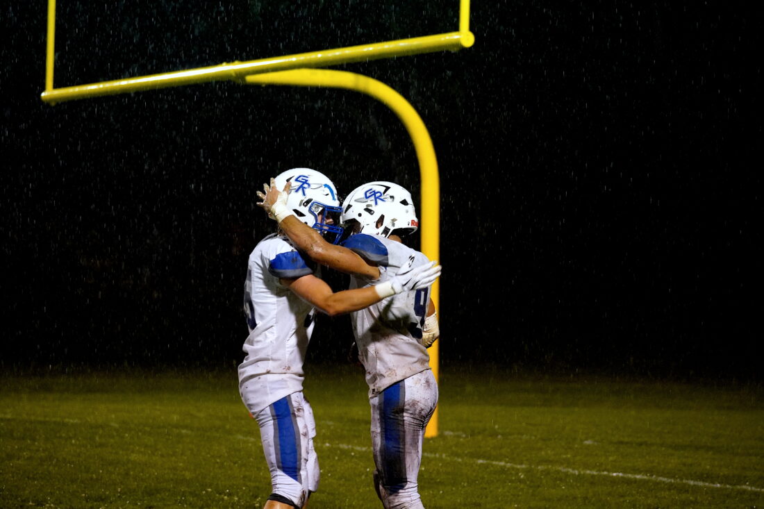 With rain pelting down on them, G-R offensive lineman Garrett Gebel, left, and Treyvon Herron, right, celebrate in the North Tama end zone Herron’s touchdown in the second quarter on Friday, Oct. 17, in Traer. PHOTO BY RUBY F. MCALLISTER
