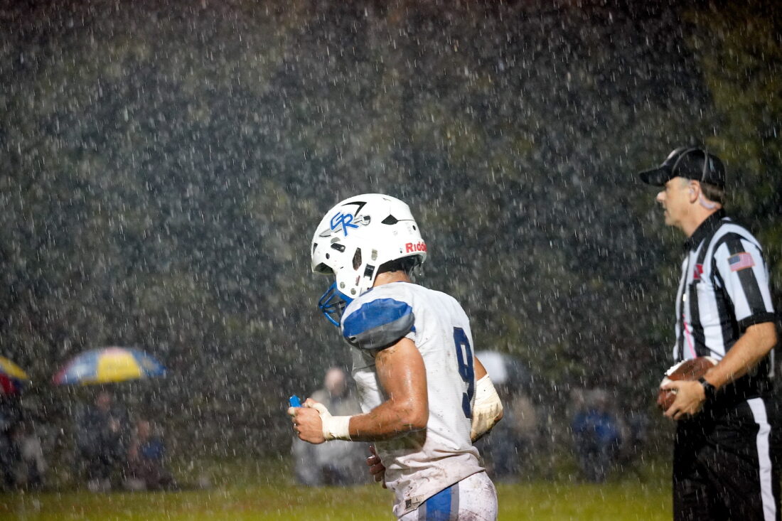 Gladbrook-Reinbeck running back Treyvon Herron (9) makes his way back to the line of scrimmage through sheets of rain after scoring a touchdown in the second quarter against the North Tama Redhawks on Oct. 17 in Traer. PHOTO BY RUBY F. MCALLISTER