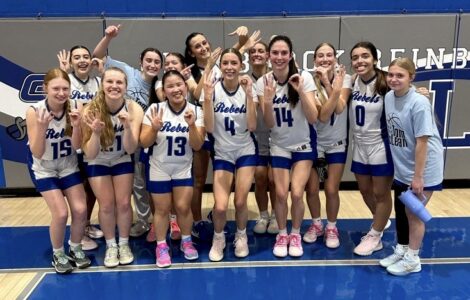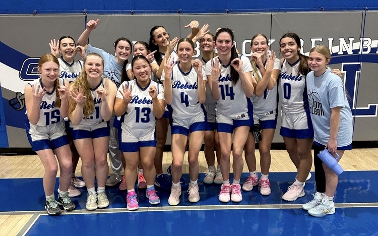 Rebel senior point guard Elly Sieh (4) along with her teammates flash the numbers ‘4-0’ with their fingers on Thursday, Jan. 22, following G-R’s victory over Sumner-Fredericksburg during which Sieh set her school’s single-game scoring record with 40 points. PHOTO COURTESY OF GLADBROOK-REINBECK SCHOOLS/FACEBOOK