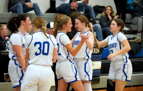 - GMG senior point guard Macie Sanders, second from right, is congratulated by her teammate Taelyn Sash as she comes off the court during a late game time-out after sinking a 3-pointer against Tripoli on Thursday, Jan. 29, 2026, in Garwin. PHOTO BY RUBY F. MCALLISTER