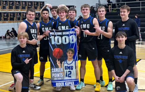 - GMG senior Rider Kupka (front row, center) smiles alongside his Wolverine basketball teammates on Friday, Feb. 6, 2026, at BCLUW High School in Conrad while celebrating his 1,000th career point. GMG defeated the Comets, 54-39, earlier that evening for the conference win. PHOTO COURTESY OF TAMMY WOODBURY