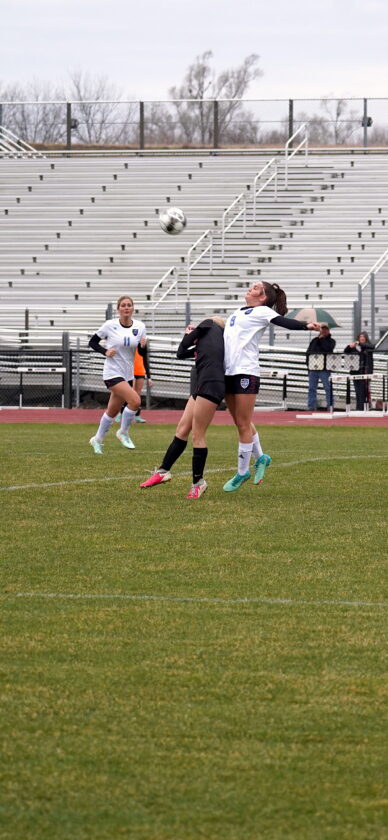 GCGR junior Ayla Baer, right, uses a chest trap over a ducking Knights player to control a drop kick April 9 in La Porte City. PHOTO BY RUBY F. MCALLISTER