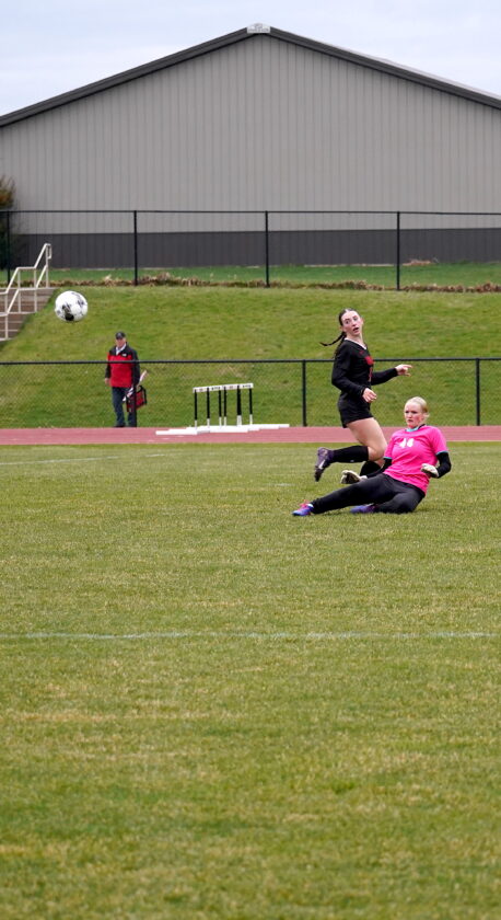 - GCGR junior Ayla Baer, right, uses a chest trap over a ducking Knights player to control a drop kick April 9 in La Porte City. PHOTO BY RUBY F. MCALLISTER