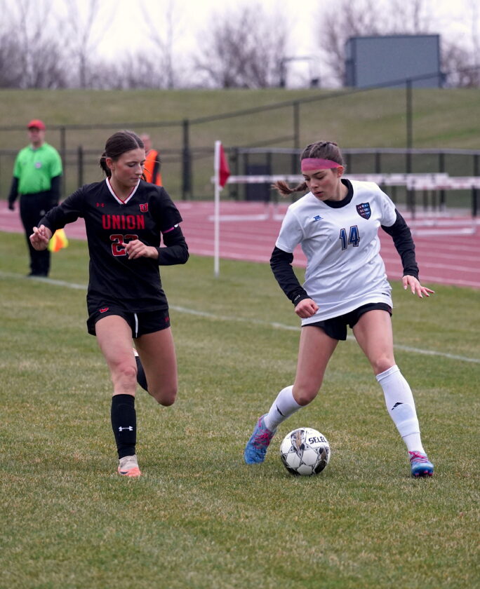 - GCGR defender Ayla Baer, left, fights to retain control of the ball against Union-North Tama sophomore Ellie Pospisil (4) April 9 in La Porte City. PHOTO BY RUBY F. MCALLISTER