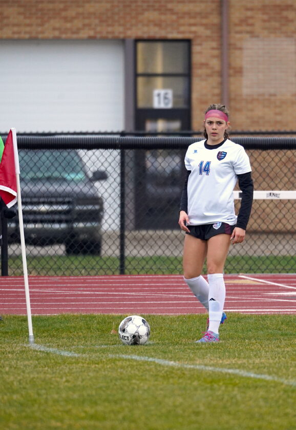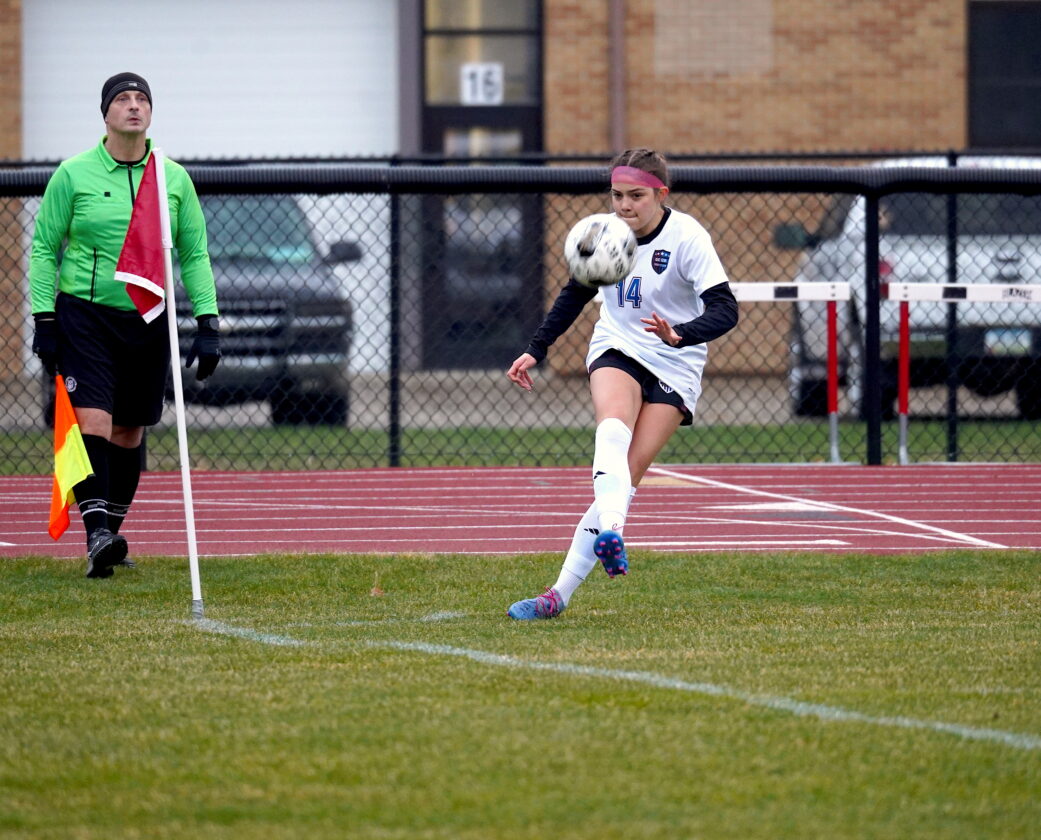 Rebel freshman Karina Arvizu-Ersland (14) executes a corner kick Thursday, April 9, in La Porte City. PHOTO BY RUBY F. MCALLISTER