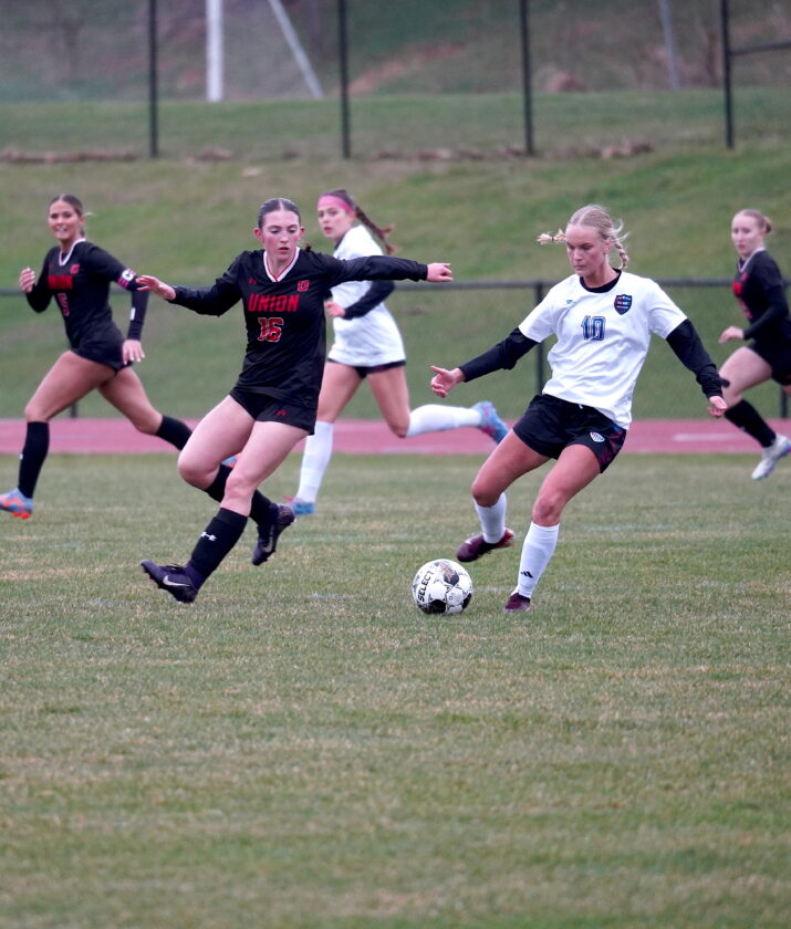 - Union-North Tama’s Hannah Grote (13) chases after Rebel junior Prycely Beard (1) as she sends a shot toward the net April 9 in La Porte City. The Knights’ defense spent much of the evening in constant motion against GCGR’s ample firepower. PHOTO BY RUBY F. MCALLISTER