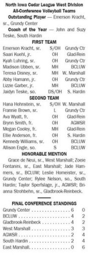The two-time kills leader in the NICL West Division has earned all-conference first-team honors for the second year in a row, too. Gladbrook-Reinbeck junior outside hitter Saari Kuehl was named first-team all-NICL West in back-to-back seasons to go along with her second-team honor from a ...