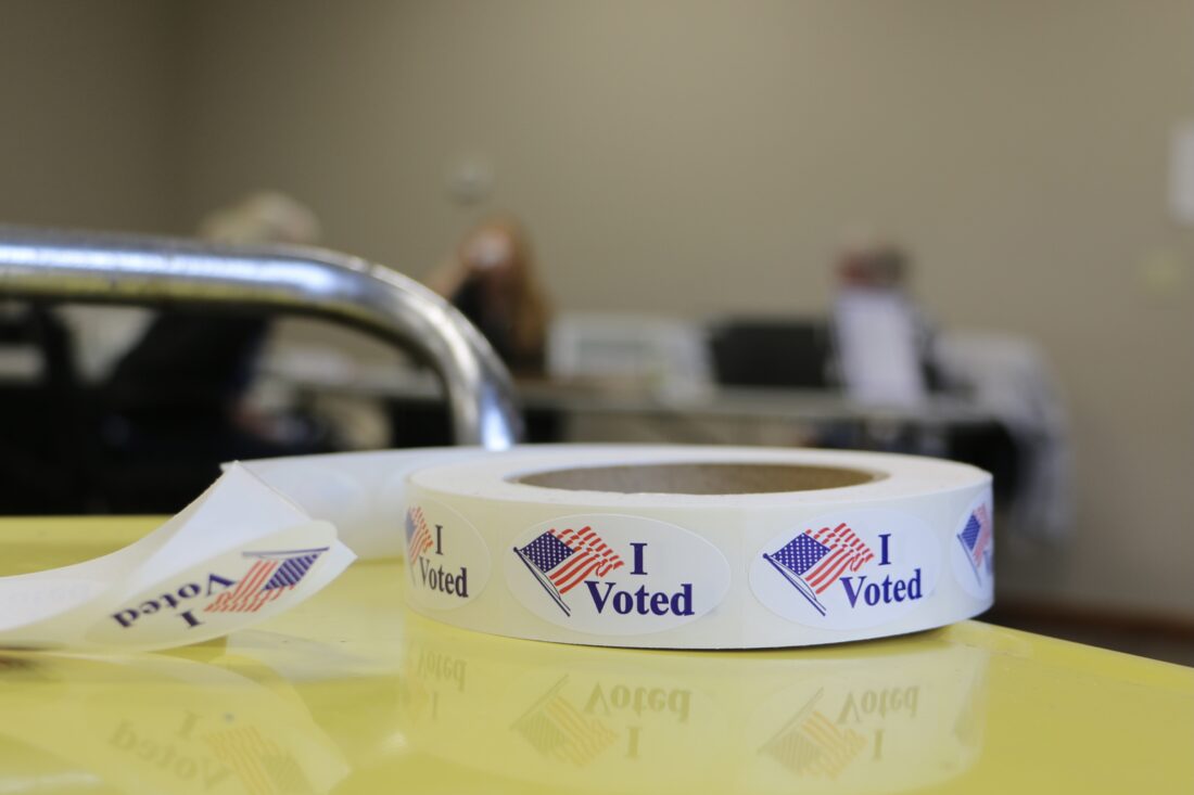 A spool of ‘I Voted’ stickers rests on a cart at Clutier City Hall during a past city-school election. PHOTO BY RUBY F. MCALLISTER